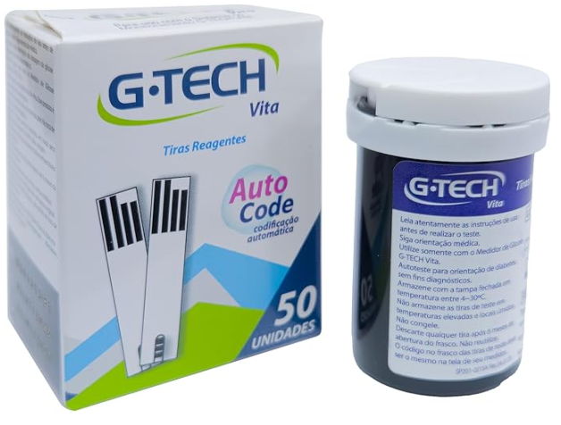 As Tiras Reagentes G-TECH Vita, são apresentadas em embalagens 50 tiras. Apresentam resultados precisos e seguros, contando com a Tecnologia Auto Code, que dispensa codificação prévia, torna o ato de medir a glicose, mais simples e rápido. Com a moderna enzima Glicose Desidrogenase (FAD-GDH), é possivel ter resultados em amostras de sangue capilar, arterial, venoso e neonatal, sendo assim, uma excelente ferramente tanto para uso residencial quanto de ambientes hospitalares.