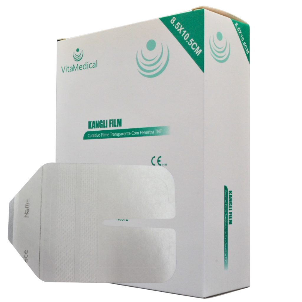 O Kangli Film com Fenestra TNT é um curativo de filme transparente com um orifício central (fenestra) para a fixação de cateteres ou sondas, e um reforço de TNT (tecido não tecido) que aumenta a aderência da película, impedindo a entrada de bactérias e água, mas permitindo trocas gasosas e a visualização da lesão ou do sítio vascular.