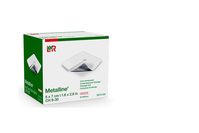 Curativo METALLINE é uma compressa altamente absorvente composta por algodão, viscose e uma camada de contato com a ferida que contém partículas de alumínio que evita a aderência da compressa ao leito da ferida e não favorece o crescimento bacteriano.